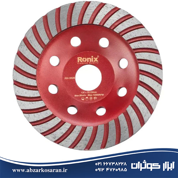 رونیکس تاکنون مجموعهای گسترده از ابزارها، قطعات و متعلقات متنوع را تولید کرده است. در این میان، تیغههای گرانیتساب کاسهای نمونهای برجسته از متعلقات ابزارهای برشی این برند به شمار میروند. صفحه ساب گرانیت کاسهای ۱۲۵ میلیمتری رونیکس Ronix مدل RH-3528، با دوام بالا و کیفیت برش مناسب، گزینهای ایدهآل برای فرزها و دستگاههای برش سنگ است که نیازهای کاربران مختلف را بهخوبی پاسخ میدهد. این صفحه دارای قطر ۱۲۵ میلیمتر، قطر سوراخ مرکزی ۲۲.۲۳ میلیمتر و ضخامت ۳ میلیمتر است. همچنین حداکثر سرعت چرخش آن به ۱۲۲۰۰ دور در دقیقه میرسد. دیسک توربو از مواد باکیفیت و با طول عمر بالا ساخته شده است. بدنه این دیسک که از فولاد A3 دقیق و متعادل تولید شده، با کاهش لرزش و ارتعاش ابزار، کنترل بیشتری برای کاربر ایجاد میکند. طراحی کاسهای دیسک نیز باعث میشود که پرداختهایی شفاف و براق بر روی سطوح گرانیتی ارائه دهد. ۳۰ سگمنت این دیسک کاسهای که ضخامت هر یک ۵.۵ میلیمتر است، از پودر الماس مصنوعی با فناوری پیشرفته تولید شدهاند و عملکردی بسیار کارآمد ارائه میدهند.