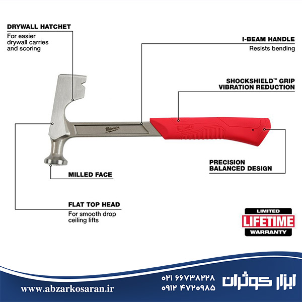 انتهای دستهی ابزار نیز حالت تبرمانند یا Hatchet دارد که برای بلندکردن، جابهجایی یا شکافتن لبهی صفحات دیوار خشک کاربرد دارد. سطح ضربه (Face) این مدل بهصورت فرزخورده یا Milled طراحی شده تا در کار با صفحات گچی، چسبندگی بیشتری روی سطح ایجاد کرده و لغزش هنگام ضربه را کاهش دهد. بدنهی چکش کاملاً از فولاد ساخته شده و طول کلی آن حدود ۳۵ سانتیمتر است که در کنار وزن مناسب، تعادل خوبی میان قدرت، کنترل و راحتی ایجاد میکند. چکش ۱۵ انس میلواکی Milwaukee مدل ۴۸۲۲۹۰۶۰ مخصوص افرادیست که در کار نصب، تعمیر و اجرای سازههای داخلی با صفحات دیوار خشک فعالیت دارند و برای افرادی که نیاز به ابزار سبک، مقاوم و تخصصی دارند انتخابی بسیار مناسب محسوب میشود.